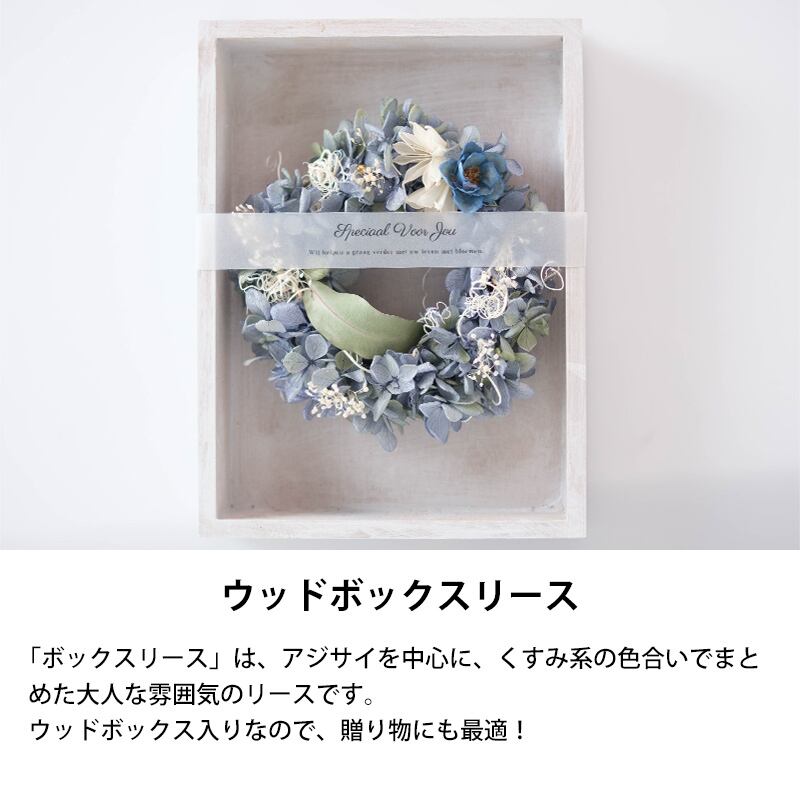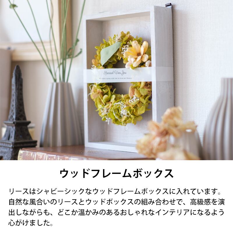 アジサイ、カスミソウ、アネモネなど、プリザーブドフラワーで作られた鮮やかなリースを、シャビーシックなウッドフレームのボックスに収めました。リースの上にはおしゃれなメッセージタグを添えて、さらに個性を演出。