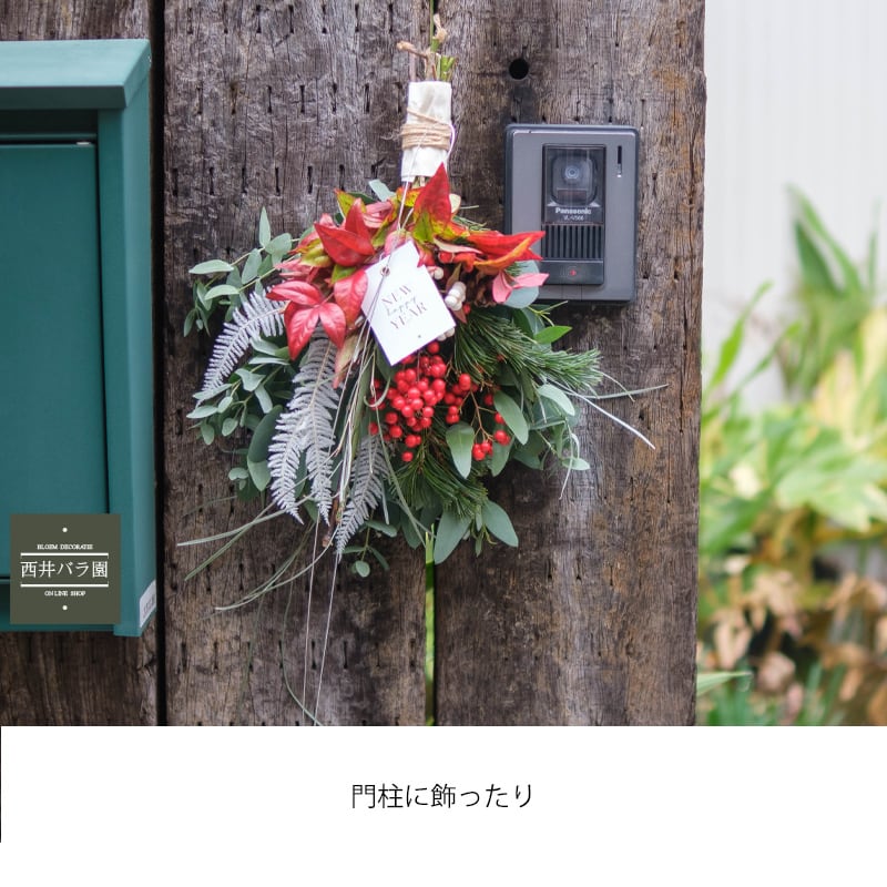迎春 正月 スワッグは、フレッシュフラワーやドライフラワーを使用しています。松竹梅をはじめ、ユーカリやナンキンハゼ、南天などの季節の花々が絶妙に組み合わさり、豪華な壁飾りを完成させました。この華やかなスワッグを玄関ドアや門柱に飾ることで、おしゃれな迎春の演出が可能です。